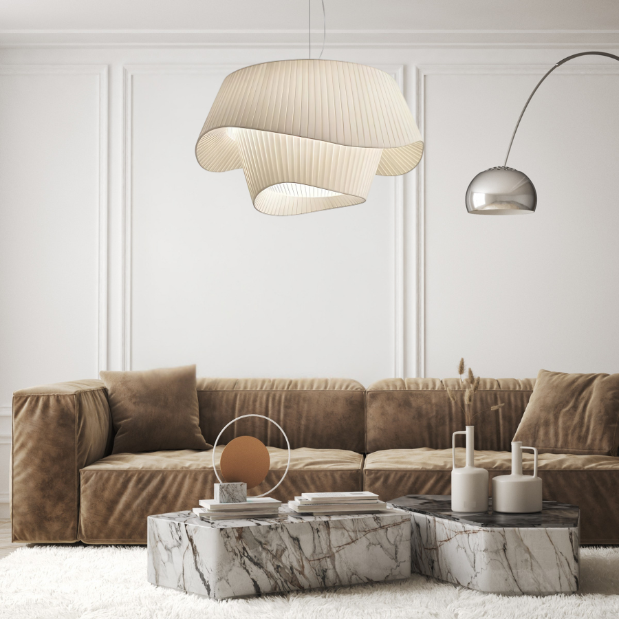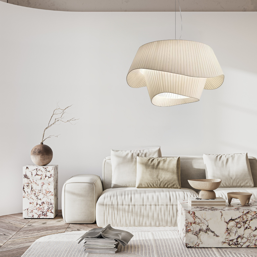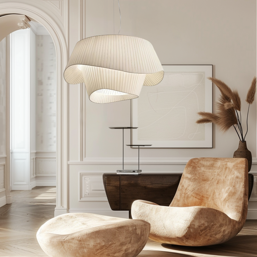 Sculptural ease for modern living. Pleated panels loop in a calm, fluid gesture, creating quiet movement that lends a composed presence to gathering spaces and private corners alike.