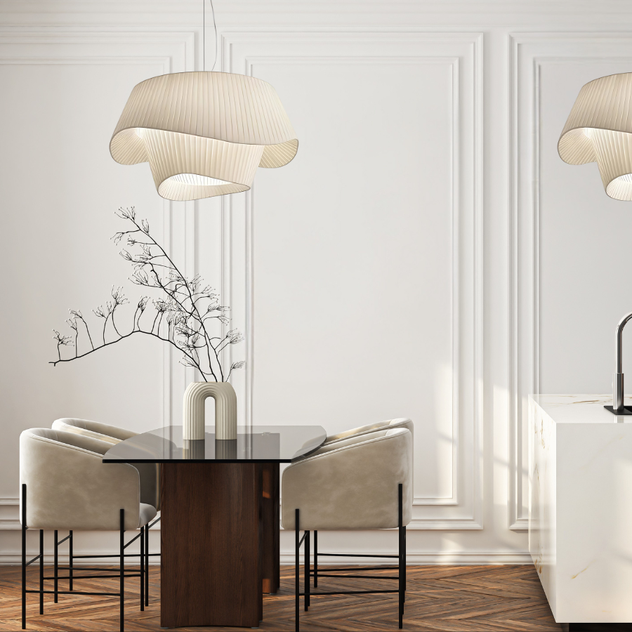 The material twists gently, forming an asymmetric shade that feels considered rather than ornate. The shape draws the eye upward, framing negative space and creating an understated focal point from every angle.